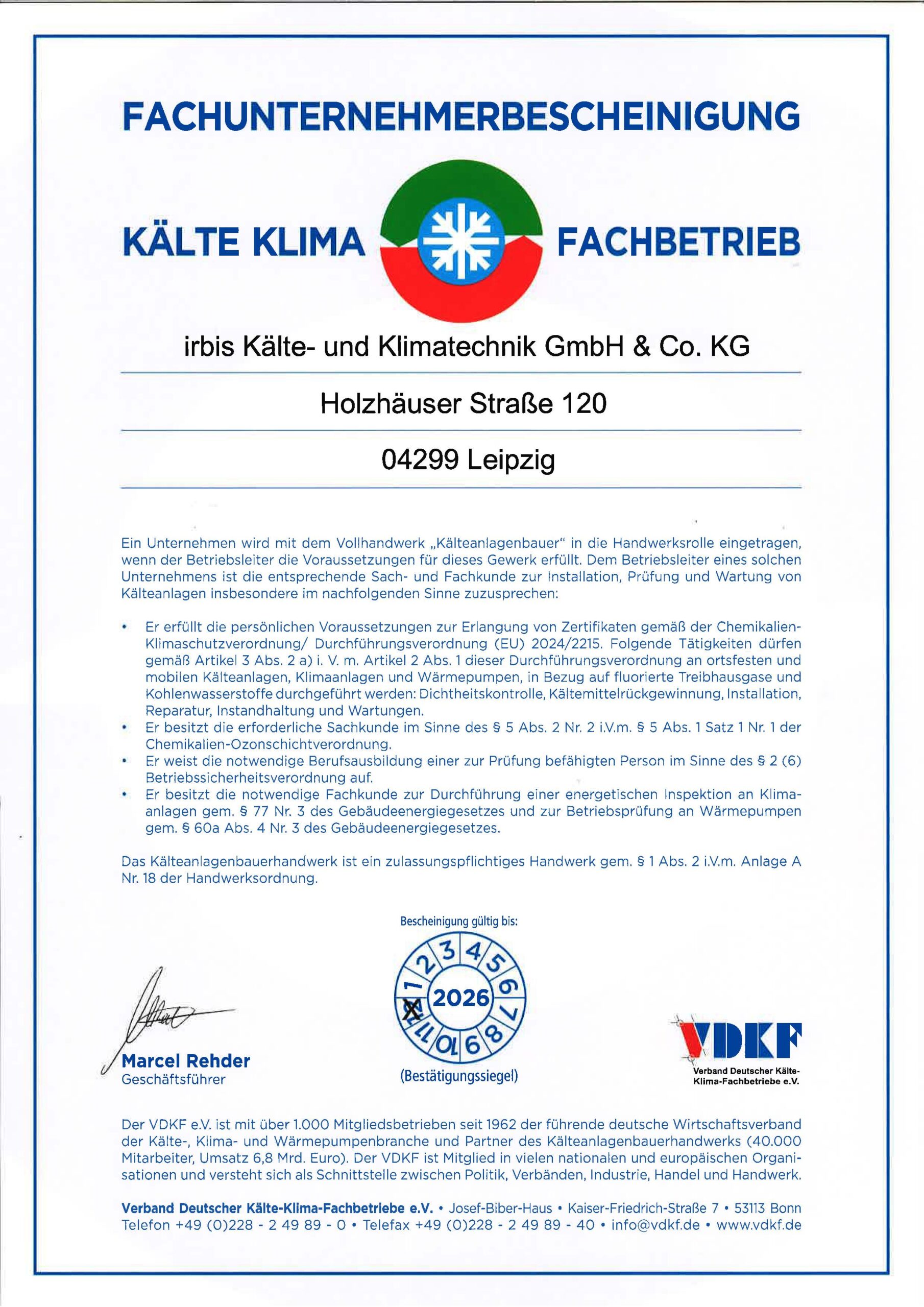 Wir sind berechtigt, Arbeiten an Kälte-/ Klimaanlagen und Wärmepumpen durchzuführen.